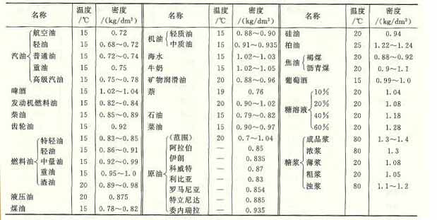 各種液體的密度參數(shù)表